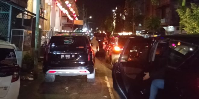Pantauan berkasriau di lokasi, Senin (24/11/2025) malam terlihat lalu lintas macet di jalan mawar depan Hotel Lion Bagansiapiapi. Penyebabnya, karena parkir mobil berlapis di badan jalan tersebut.