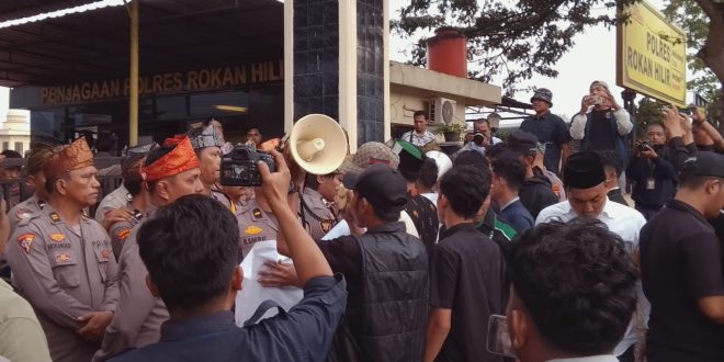 ROHIL,BerkasRiau.com – Spanduk “Selamat Datang Pejuang Apresiasi Rakyat” menyambut puluhan mahasiswa dan pemuda di depan Mapolres Rokan Hilir, Jumat (17/4/2026) sore. Tapi sambutan itu tak melunakkan tuntutan Copot Kapolres Rohil.